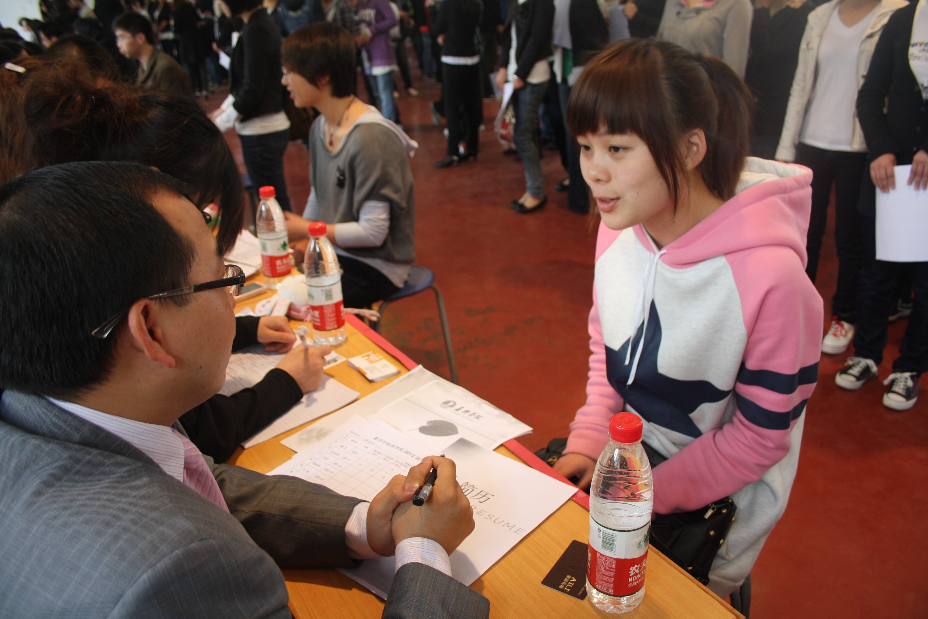 4月16日,禁漫天堂 2012届毕业生模拟面试在体育馆102隆重拉开序幕。30位人力资源专业学生担任考官助理,配合校外邀请的30位面试考官,共同面试了前来应聘的2012届毕业生。嘉兴学院学生工作处副处长薛峰老师、禁漫天堂 党委副书记郝文静老师、禁漫天堂 各系研究所所长和就业指导办公室老师也参加了本次模拟面试,并给予积极肯定。